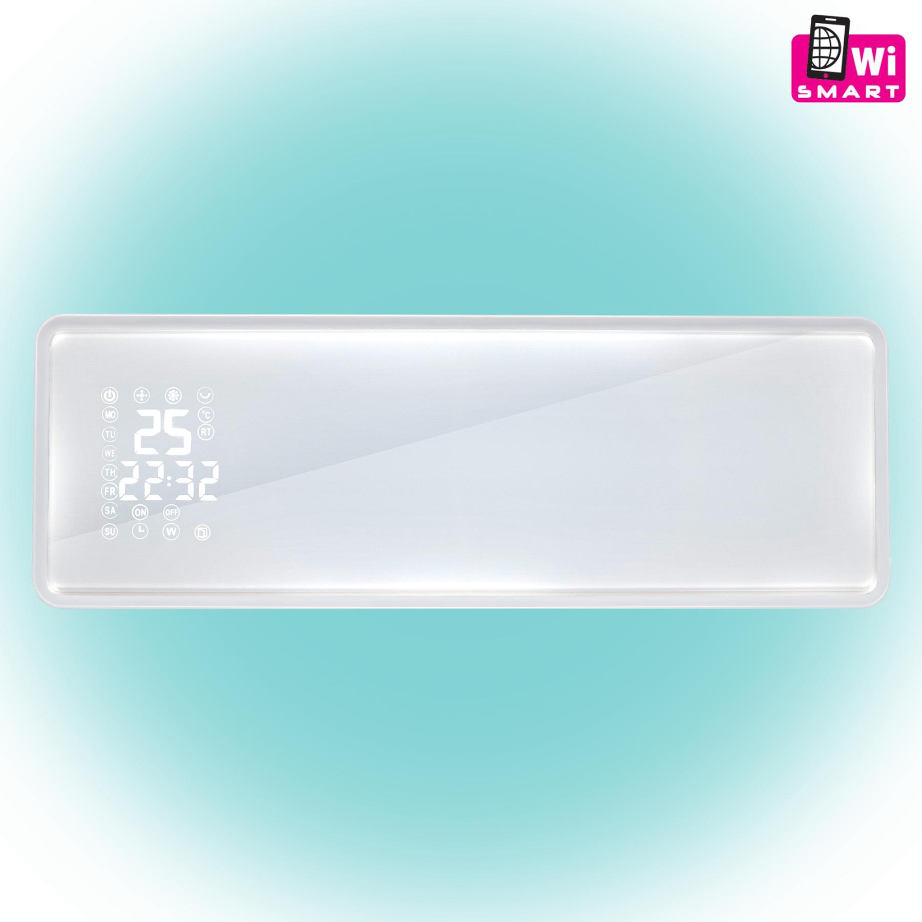 Ez a fehér üveg előlappal ellátott készülék két fűtési fokozattal rendelkezik: 1000 W és 2000 W, így könnyedén szabályozhatja a hőmérsékletet az igényeinek megfelelően. A fali elhelyezésű fűtőtest kompakt méretének (54 x 18,5 x 12 cm) köszönhetően bárhol elhelyezhető a lakásban. Az eszköz okostelefonos alkalmazással távolról is vezérelhető, így WiFi kapcsolaton keresztül bármikor és bárhonnan szabályozhatja a fűtést. A távirányítóval minden funkció könnyedén irányítható, beleértve a lengő légterelő lamellát, amely biztosítja a meleg levegő egyenletes eloszlását a helyiségben.
