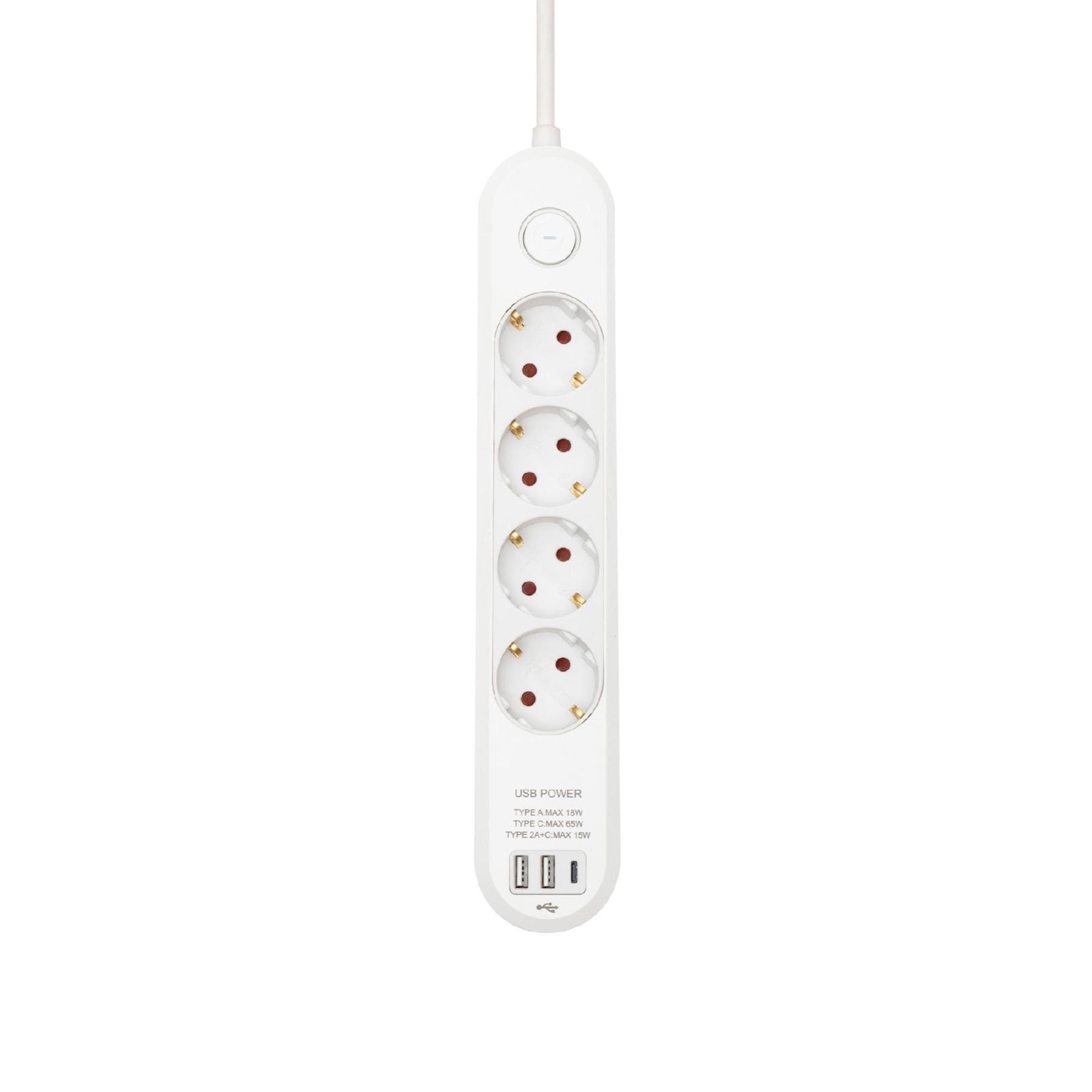 HOME NV4KUSBC hálózati elosztó, 1,5 m, H05VV-F 3G1,5 mm2 kábel, 4 védőérintkezős aljzat, USB töltőaljzat, max. 3680W, kétpólusú kapcsoló, beltéri kivitel